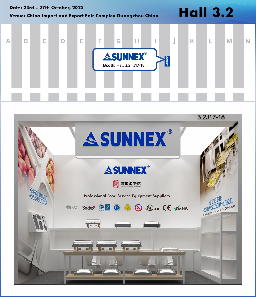 Guangzhou, China – Octubre de 2025 – SUNNEX Century (Shenzhen) Ltd., un fabricante líder de artículos de buffet, calentadores, dispensadores de bebidas y artículos para el hogar de primera calidad, se complace en invitar a compradores internacionales, medios de comunicación y profesionales de la industria a visitar nuestros stands en la 138.ª Feria de Importación y Exportación de China (Feria de Cantón).
